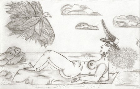 Al rato, un ave que volaba por allí, se quedó mirándole el sobrero. La mujer sintió pánico, después de que el ave entre silbidos le dijera: – ¡Muy bonito, llevas una pluma mía y por ninguna parte me citas!! No te asustes, no te la voy a quitar, únicamente te pido que luego la uses para escribir sobre nuestro encuentro.-