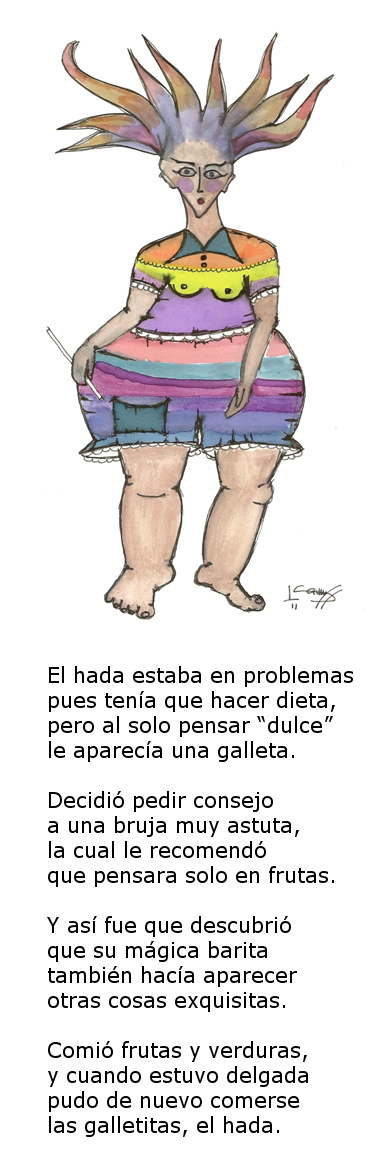 Título del cuento-poema: Un problema muy dulce © Título del dibujo: El hada robusta © Autora del cuento-poema y dibujo: Isabela Méndez @mendezisabela